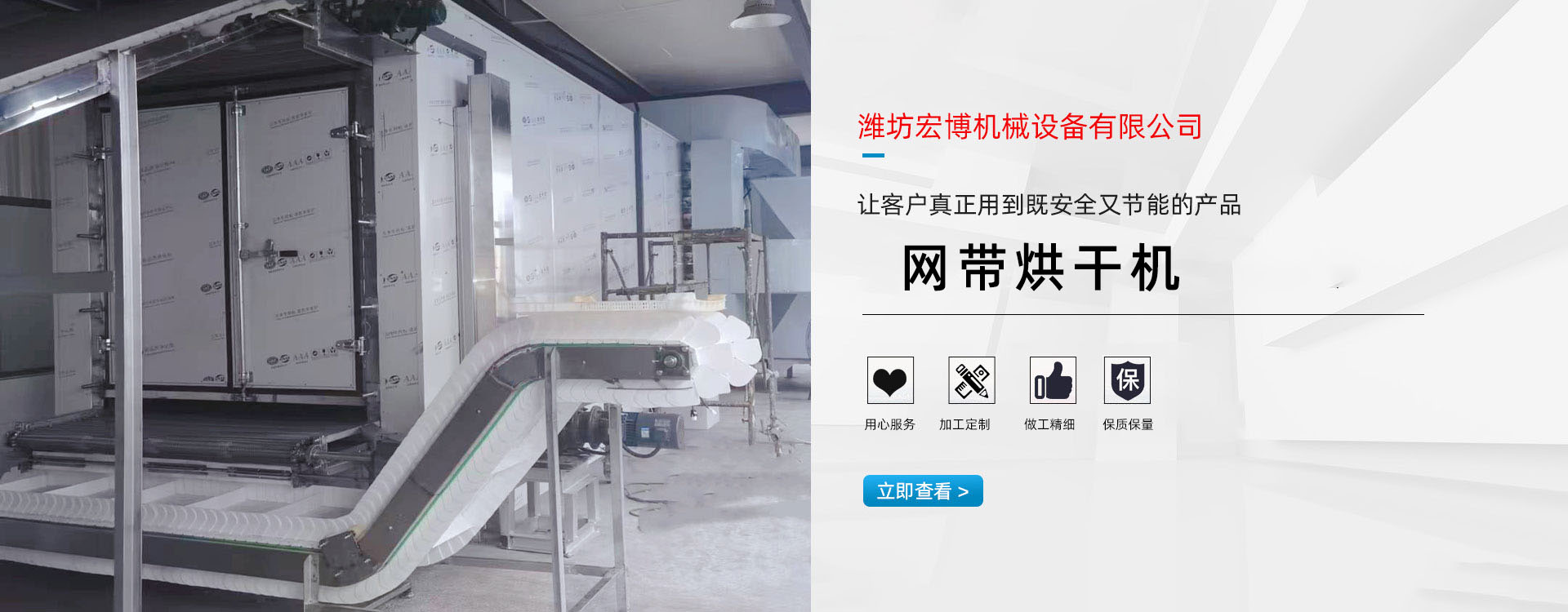 宏博公司主要產(chǎn)品有:網(wǎng)帶烘干機、食品烘干機、滾筒烘干機、隧道窯、烘干箱、燃氣熱風(fēng)爐、高大車間供暖設(shè)備、礦用防爆電加熱器等。